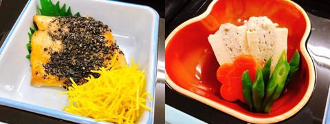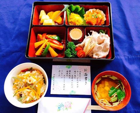 献立は、山菜おこわ、冷しゃぶサラダ、揚げ魚の黒酢あんかけ、