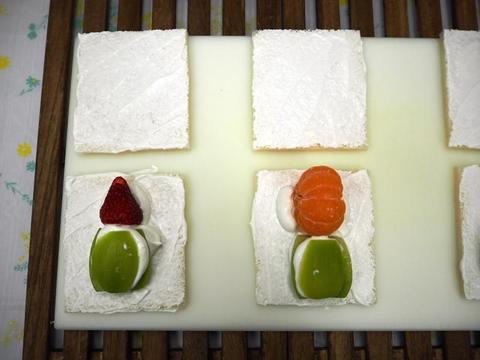 7.食パンの耳を切り落とし、挟んだフルーツの断面が見えるように半分に